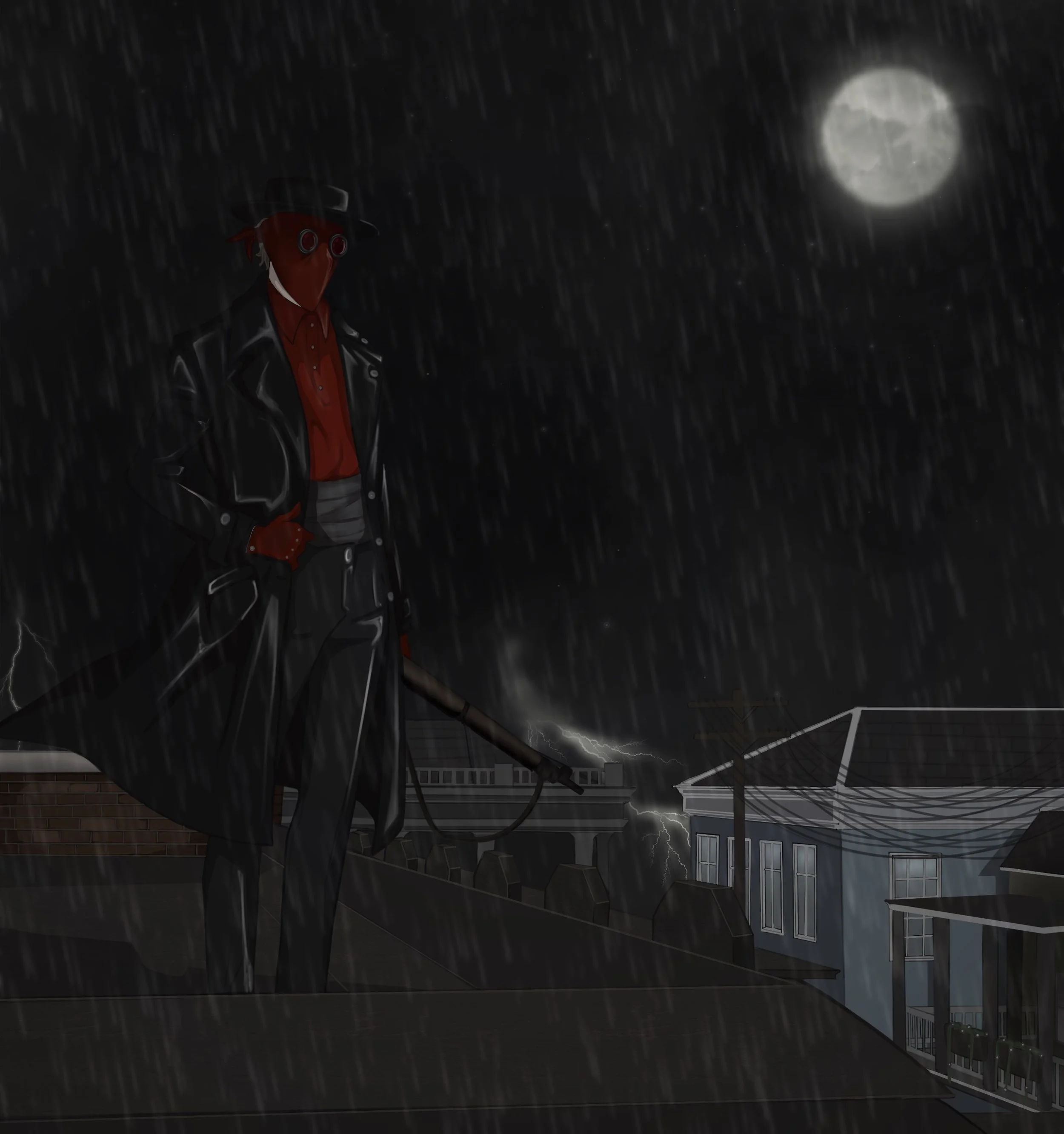 This is the first piece I’ve done with such an intricate and complex background. The client sent me a screenshot of their game avatar and showed me the sort of background they wanted- a rooftop view of a New Orleans-esque city. They wanted a piece that conveyed the character as a sort of vigilante type, so I put the character on the roof, with his rifle, on a stormy night. His outfit soaked by the rain, his mask and his weapons— all to show he is dedicated to protecting ‘his’ city.